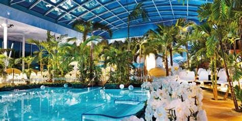 In der Palmenoase verbreiten rund 180 sorgfältig ausgewählte und liebevoll gepflegte Palmen echtes karibisches Feriengefühl. Unter dem grünen Dach warten fünf verschiedene Mineralienpools mit angenehm warmen 36 Grad und elf verschiedene Dampfbadanwendungen.
