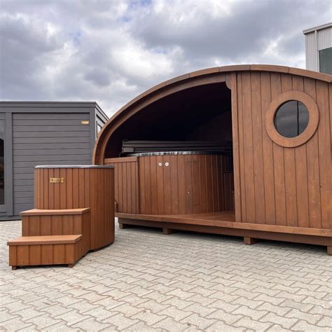 - Sauna Pod: Ist die Wölbung nicht rund, sondern wie ein Oval geformt, ergibt sich eine etwas dynamischere Optik. Der Name „Sauna Pod“ wurde von den ähnlich geformten skandinavischen Camping Pods übernommen, die allerdings nach oben spitz zulaufen.