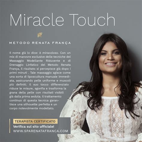 Miracle Touch ist die Massage, die die Vorteile der Lymphdrainage mit denen der Modellierungs- Techniken nach der exklusiven Mischung kombiniert, die von der Kosmetikerin Renata Franca kreiert wurde und als Renata Franca-Methode bekannt ist. Die Lymphdrainage nach der Mircale Touch-Technik ist eine der geeignetesten Behandlungen bei Hautunreinheiten wie Wasseransammlungen, Cellulite, geschwollenen Beinen und Ödemen: Durch gezieltes Kneten und Streichen werden Lymph- und Blutzirkulation angeregt, die Drainage und der Abtransport von Flüssigkeiten aus dem Stau gefördert und Schwellungen reduzieren. Die Technik der Lymphdrainage wird dann mit der Technik der Modellierung kombiniert, die auf das Fettgewebe einwirkt, indem sie die Adipozyten (Fettzellen) kontrolliert in andere Bereiche bewegt und so die Sauerstoffversorgung der Zellen verbessert.